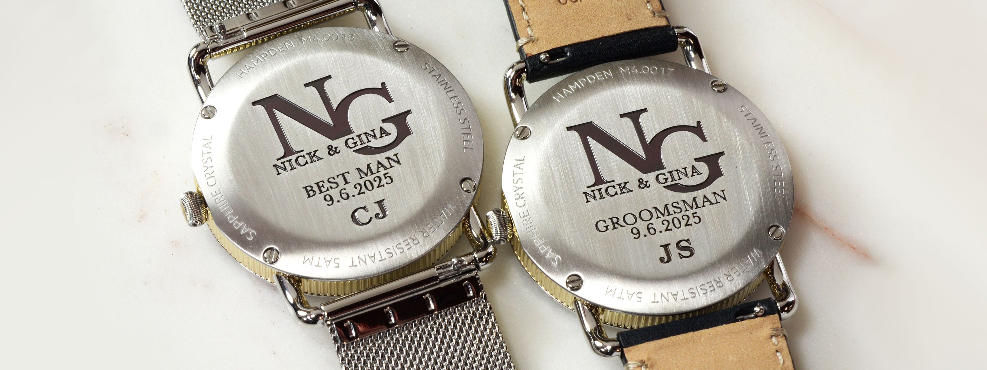 Show your appreciation for your bridal party with a gift that is as meaningful as it is timeless, a custom engraved Hampden watch. Whether you’re thanking your bridesmaids, groomsmen, or close friends who have stood by your side, a personalized timepiece is a keepsake they’ll treasure forever. Each watch can be engraved with names, dates, or a special message, creating a truly unique gift that reflects the bond you share.