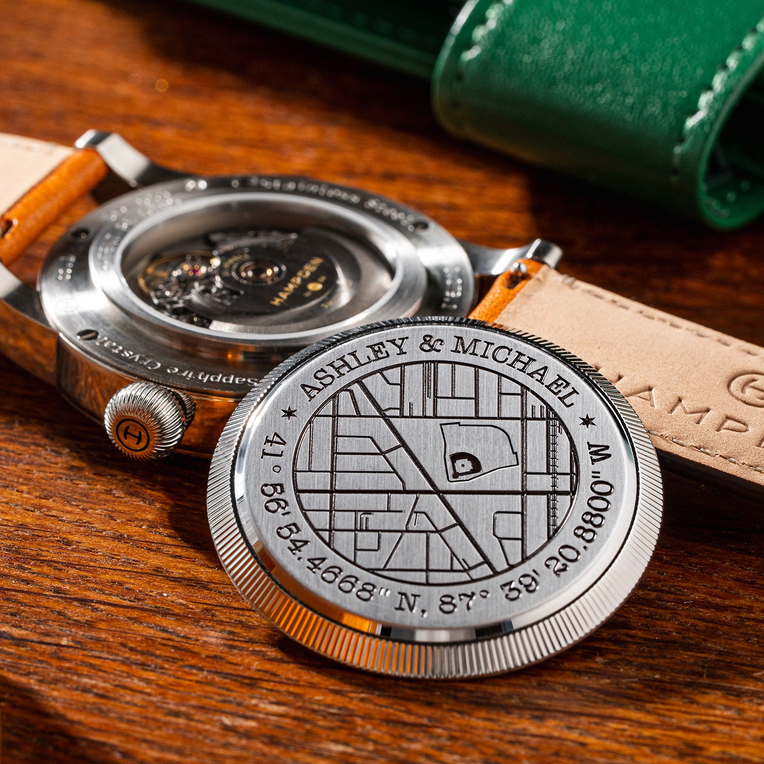 The Design Concierge lets you create a one-of-a-kind caseback for your Hampden Watch. Whether it’s an engraving, symbol, or personal message, our expert designers help bring your vision to life with precision and care.