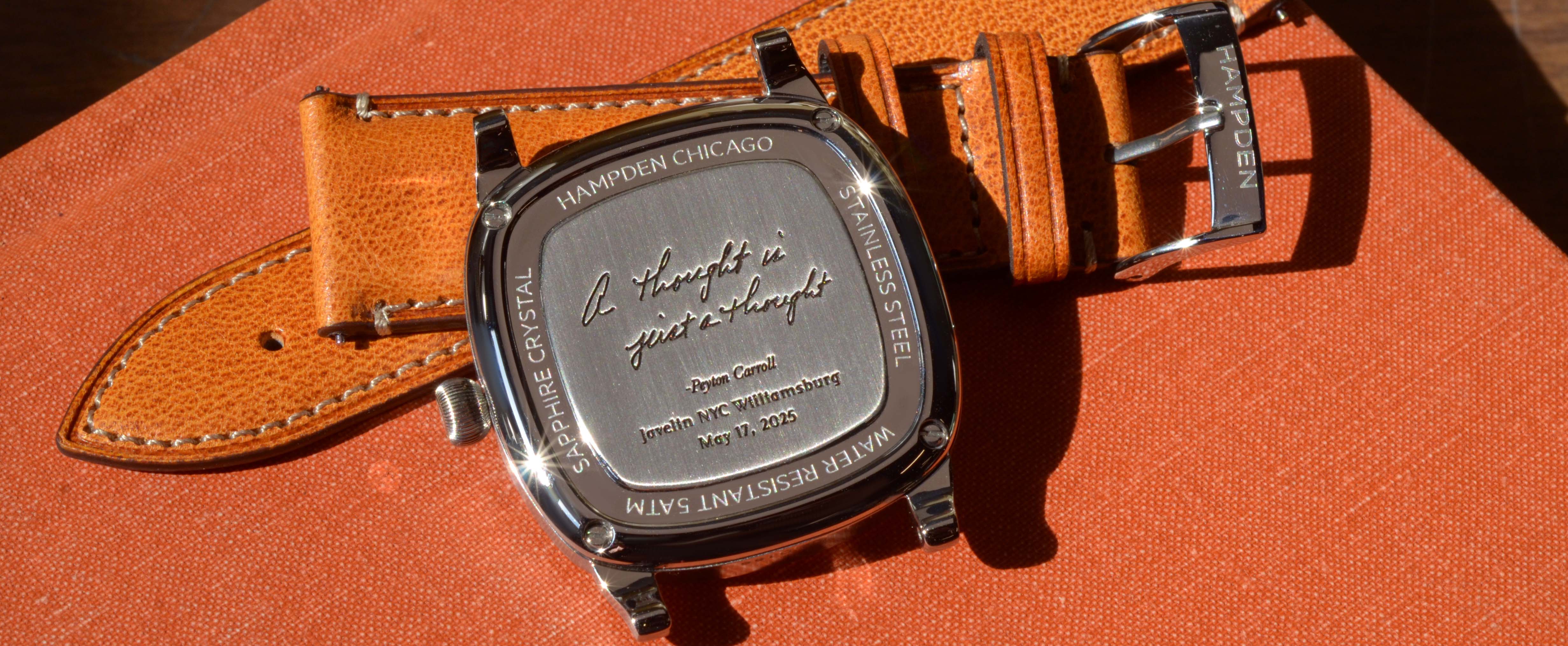 While many brands rely on diamond drag engraving—a shallow, surface-level method—Hampden uses high-precision laser engraving for unmatched depth, clarity, and durability. This advanced technique allows for intricate detail and permanence, ensuring your caseback engraving is as refined as the watch itself.